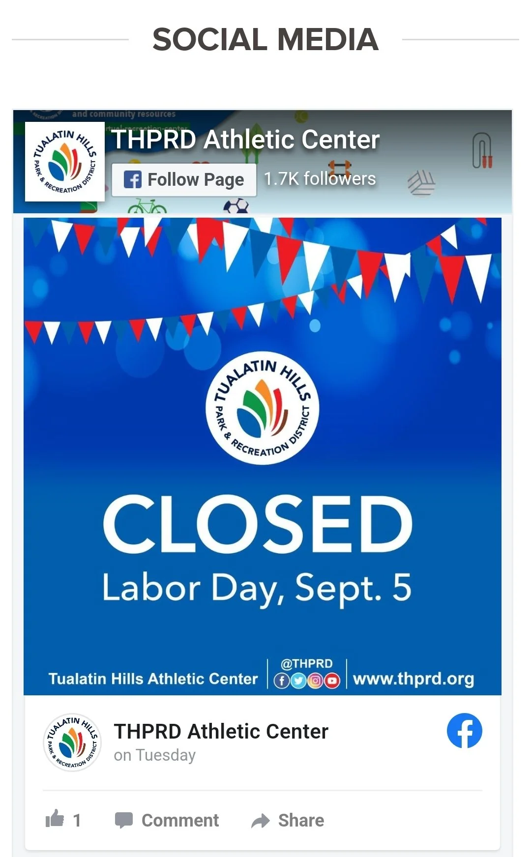 This signage was created for Tualatin Hills Parks & Recreation to inform visitors via social media of the change in schedule for Labor Day. This design utilizes the red, white, and blue present on the American flag to evoke the festivites that one would commonly associate with Labor day. Through THPRD I made many similar signs for other holidays like the 4th of July, Halloween, and Christmas as well, all with variants to be used for either social media or for print design work like posters, banners, and A-frames to use in facilities.
